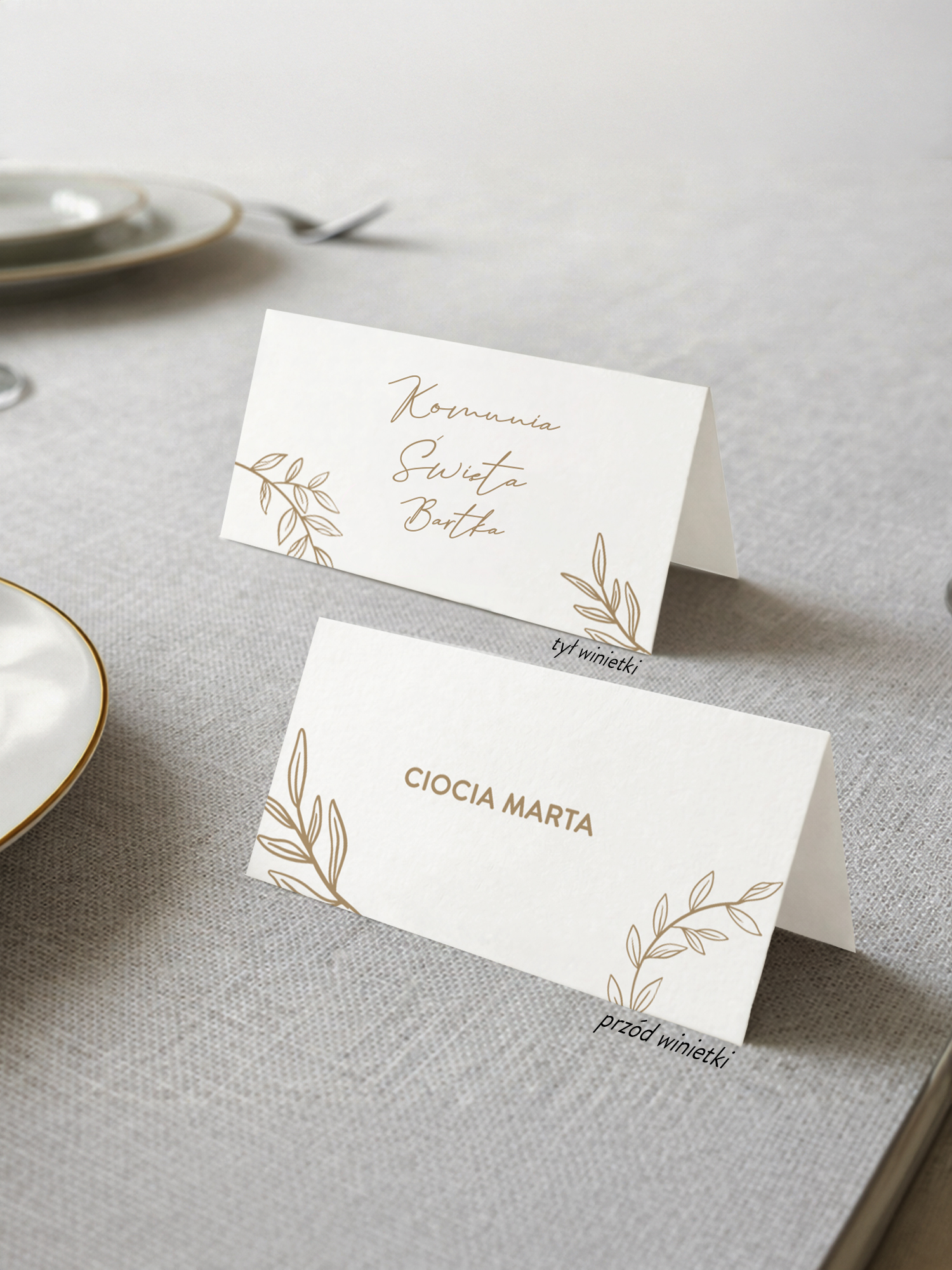 Minimalistyczne winietki na Komunię Świętą, które subtelnie uzupełnią dekorację stołu i pomogą w organizacji przyjęcia. Prosty, elegancki styl sprawia, że pasują do różnych aranżacji – od klasycznych po bardziej nowoczesne.