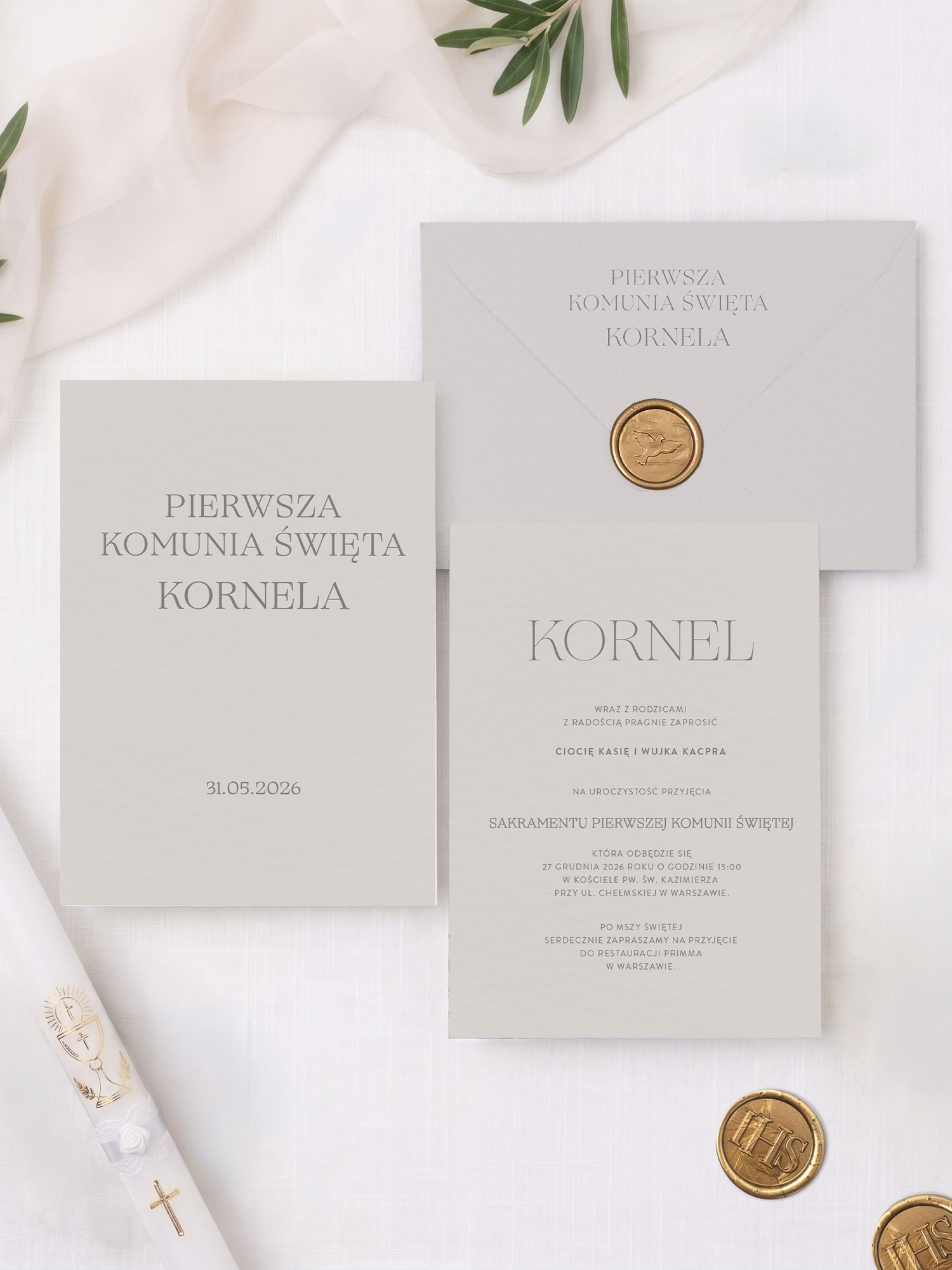 Zaproszenia na Komunię Świętą z minimalistycznym zadrukiem wykonane na jasnoszarym papierze o wysokiej gramaturze.