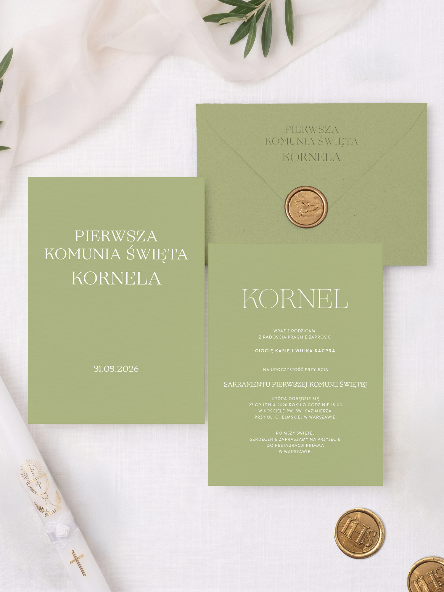 Zaproszenia na Komunię Świętą z minimalistycznym białym zadrukiem wykonane na oliwkowym papierze o wysokiej gramaturze.