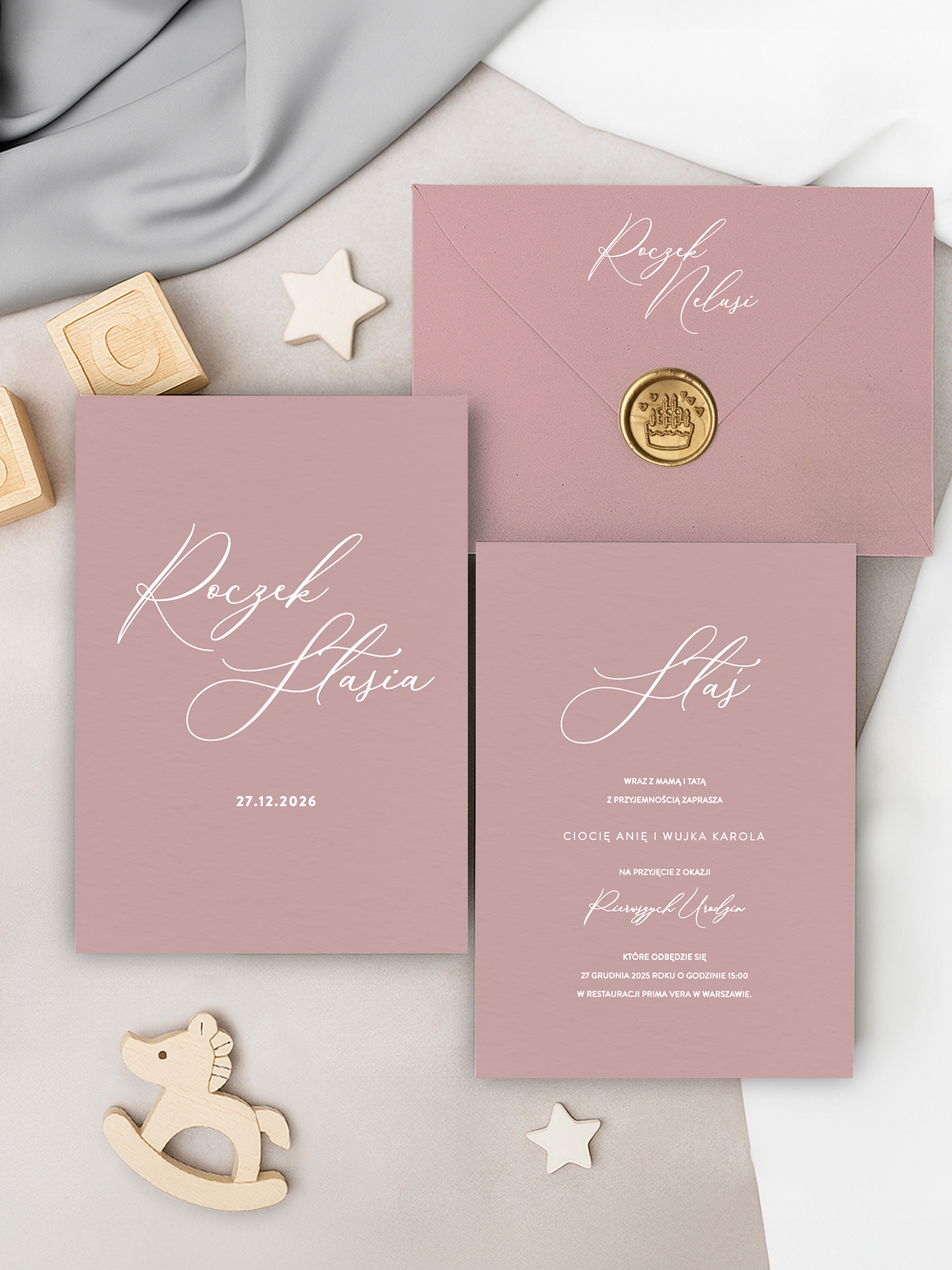 Zaproszenia na Roczek minimalistyczne różowe – biały zadruk