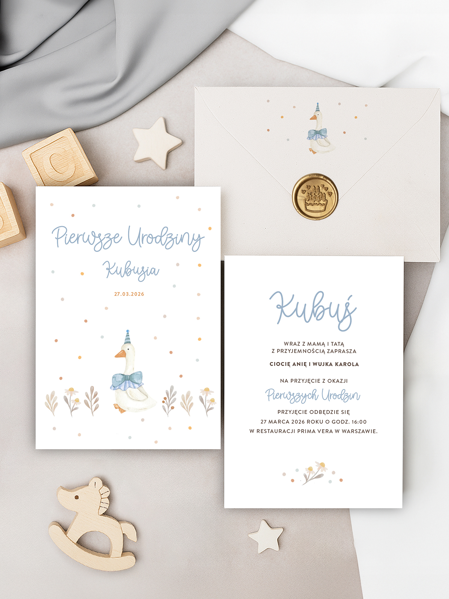 Delikatne zaproszenia na urodziny dziecięce z motywem gąski z niebieskimi akcentami. Dostępne także w różowej wersji.