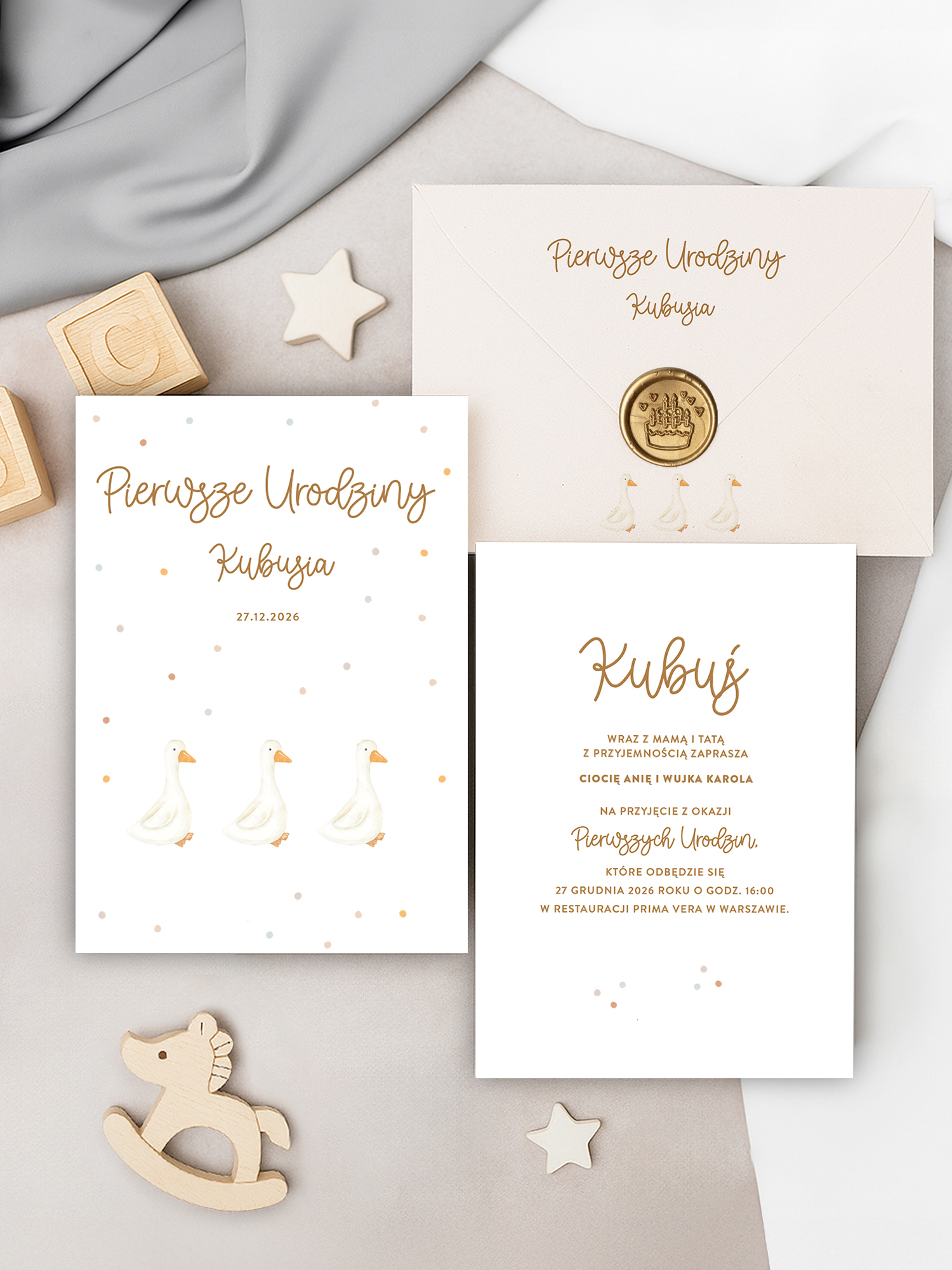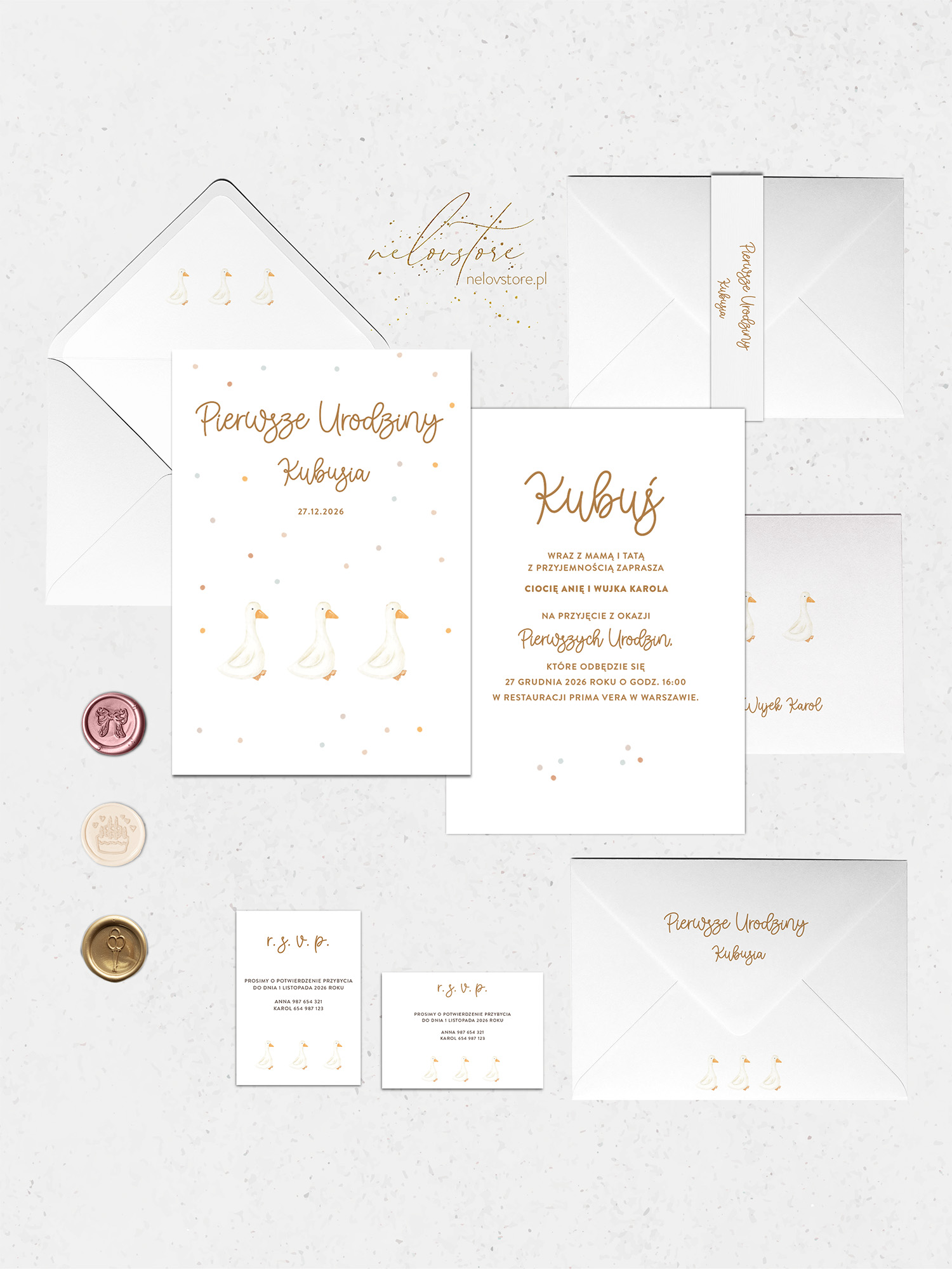Delikatne zaproszenia na urodziny dziecięce z motywem gąsek. Idealne zarówno na urodziny chłopca jak i dziewczynki.