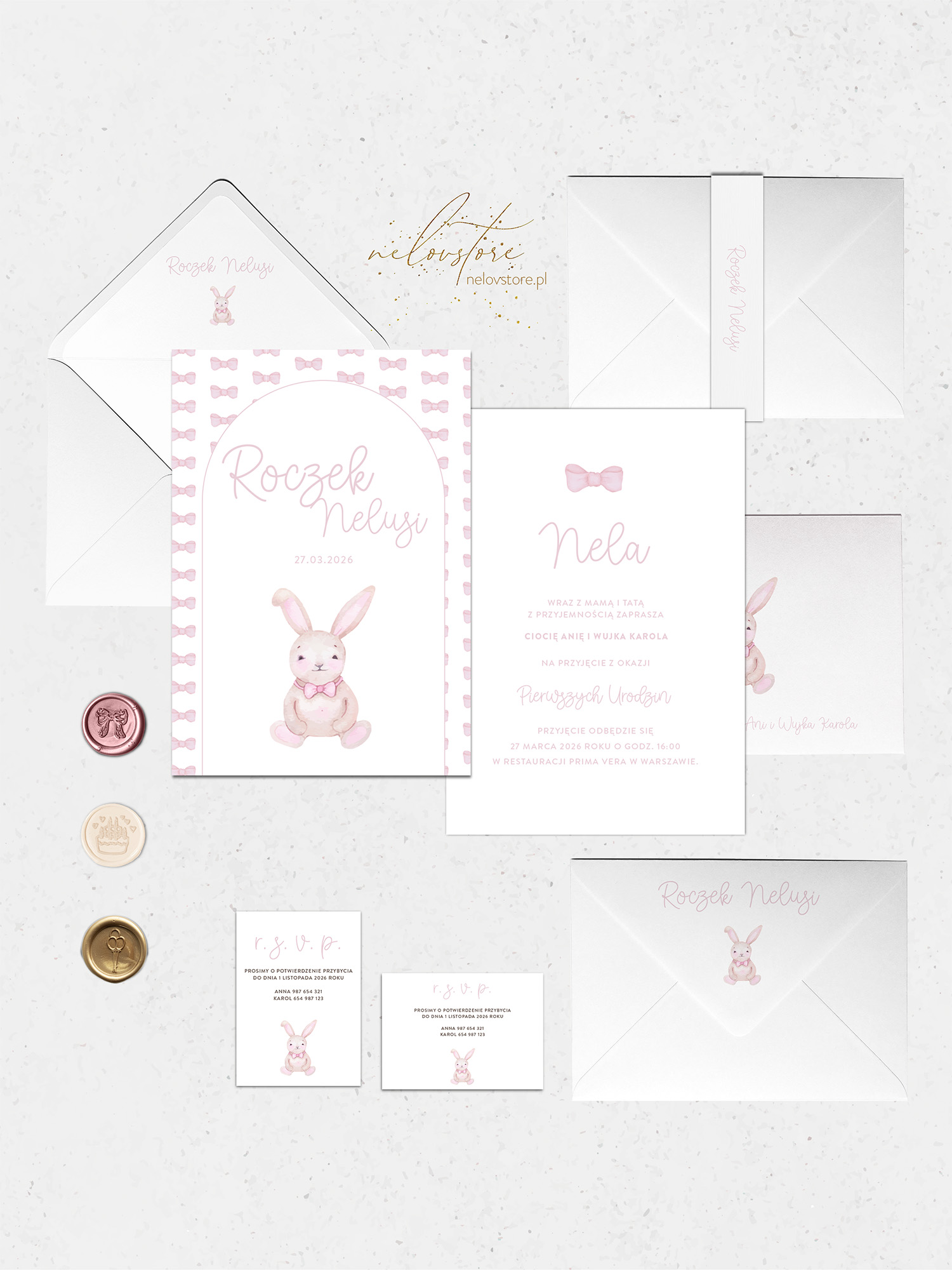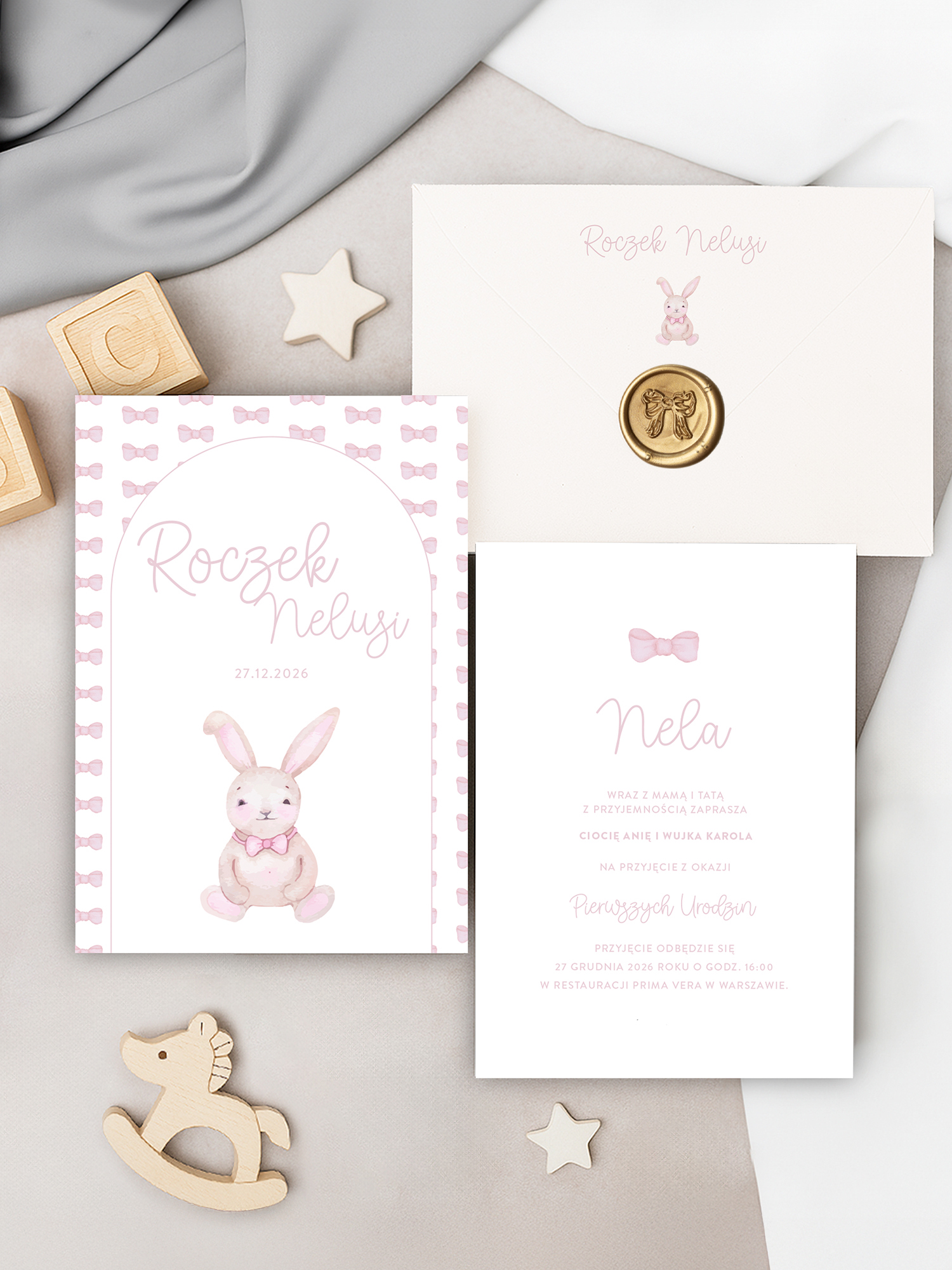 Zaproszenia na Roczek z króliczkiem i różowymi kokardkami