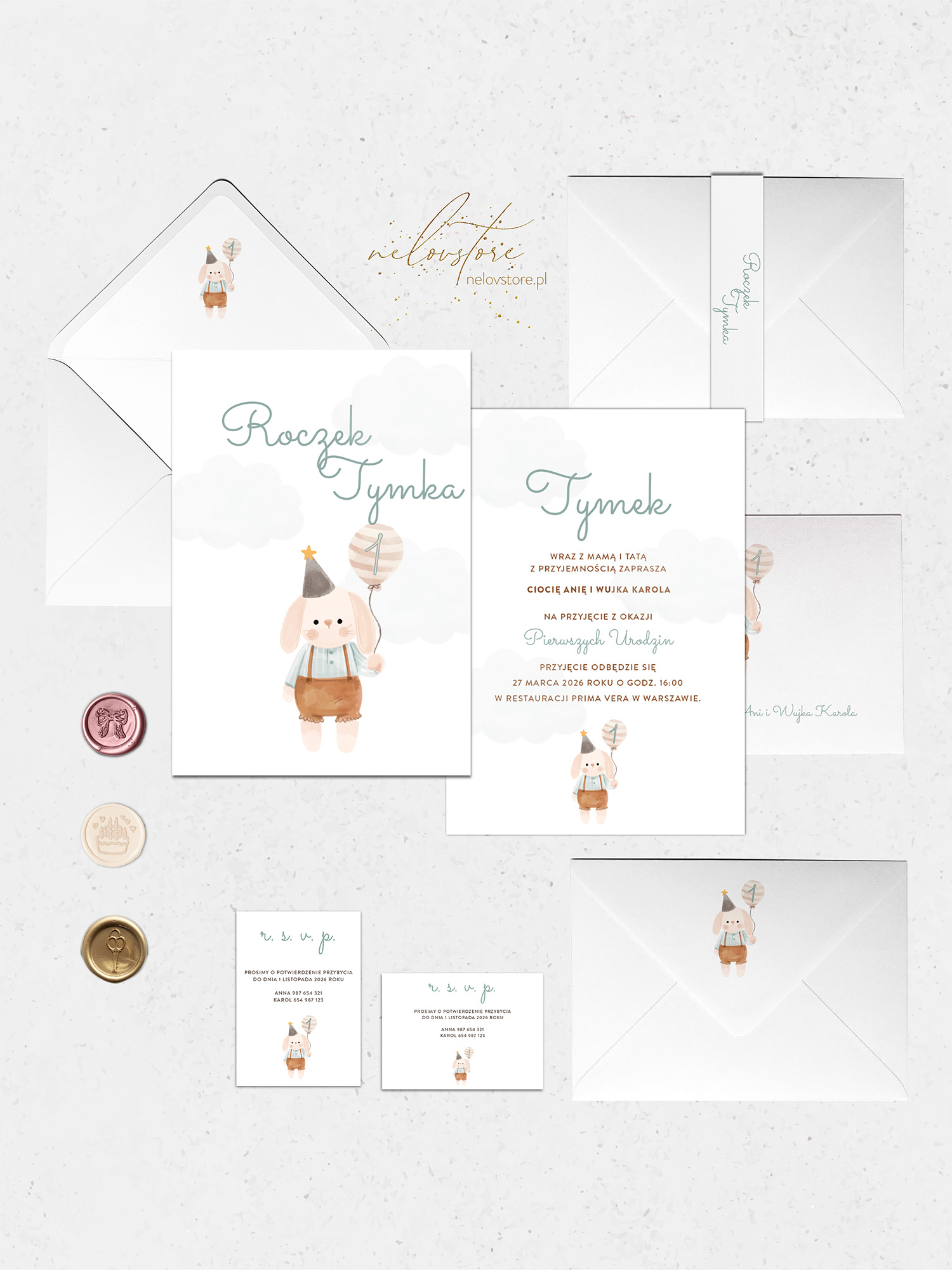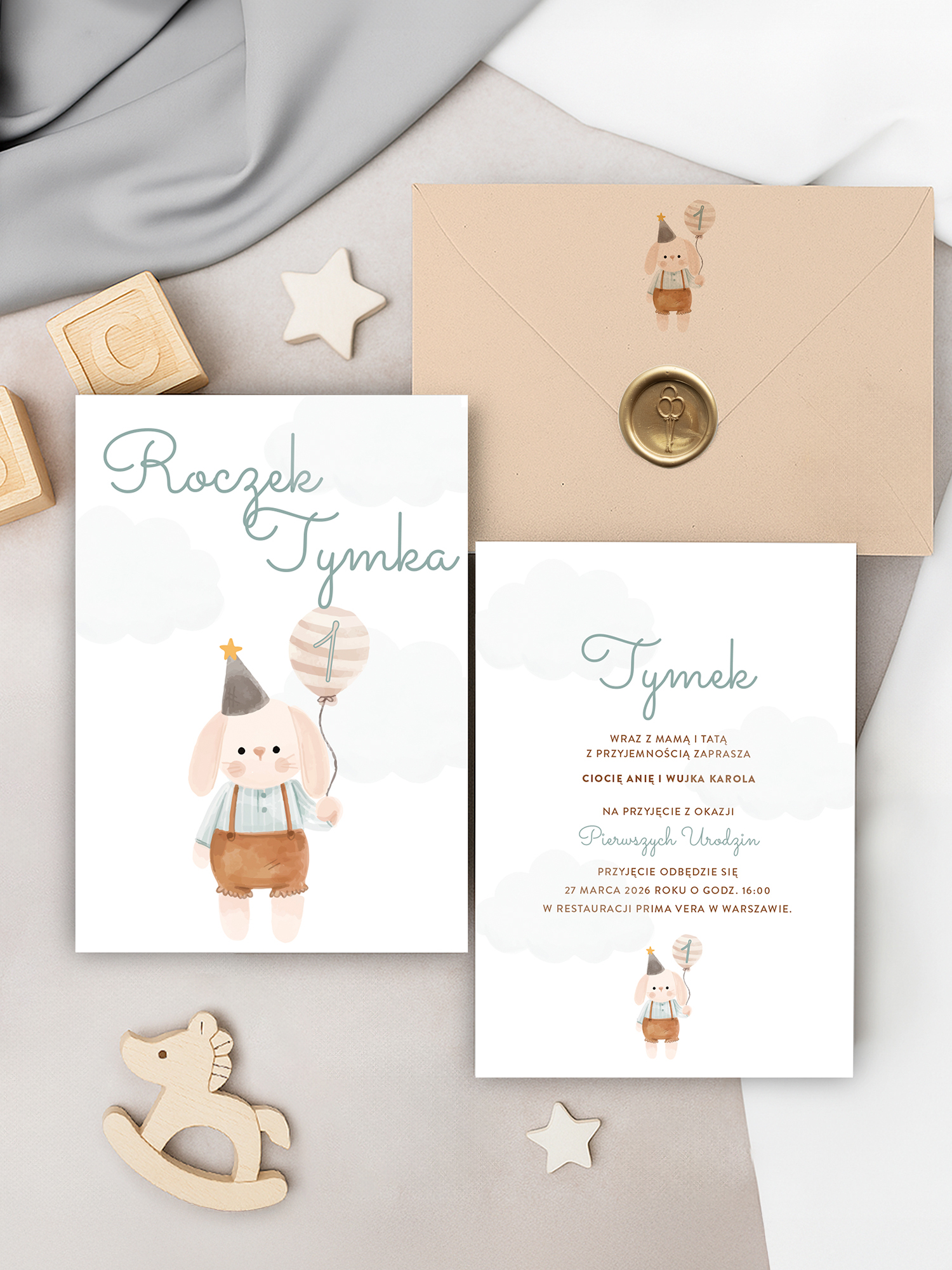 Delikatne zaproszenia na urodziny dziecięce z motywem króliczka. Idealne na urodziny w bajkowym klimacie zarówno dla chłopca ja i dziewczynki.