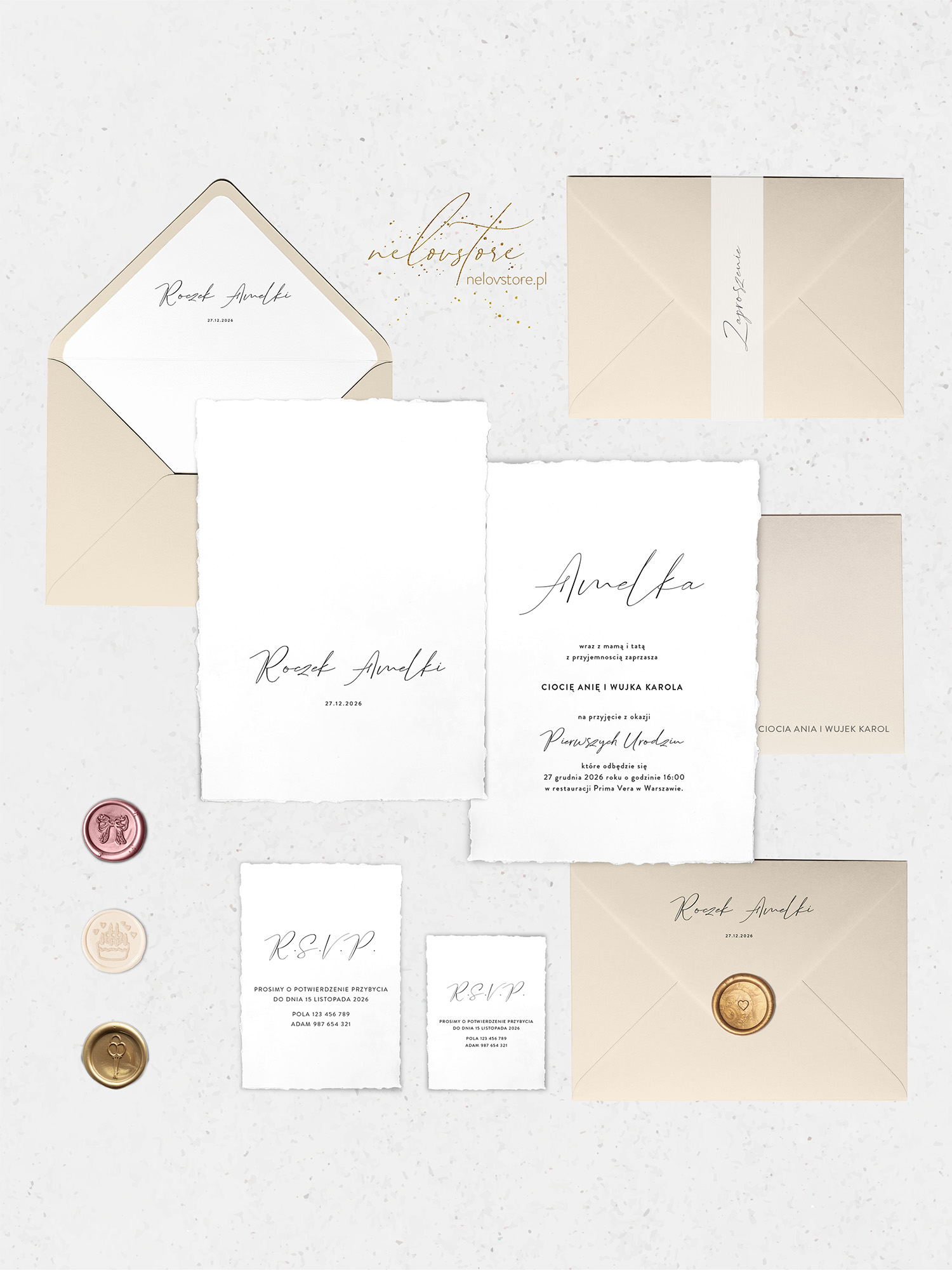 - W zestawie: dwustronne zaproszenie + koperta bez zadruku i odbicia lakowego