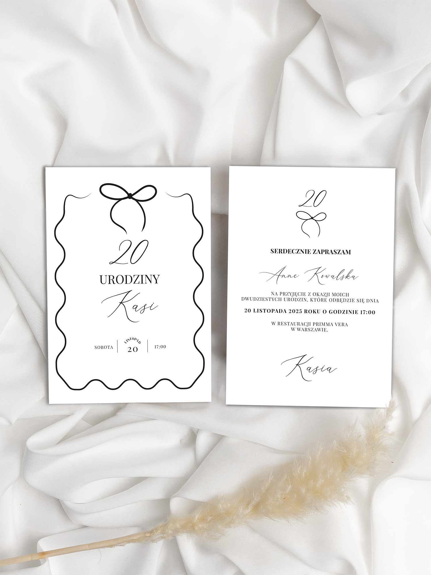 Minimalistyczne zaproszenia na urodziny z motywem kokardki. Dostępne również w innej wersji kolorystycznej.