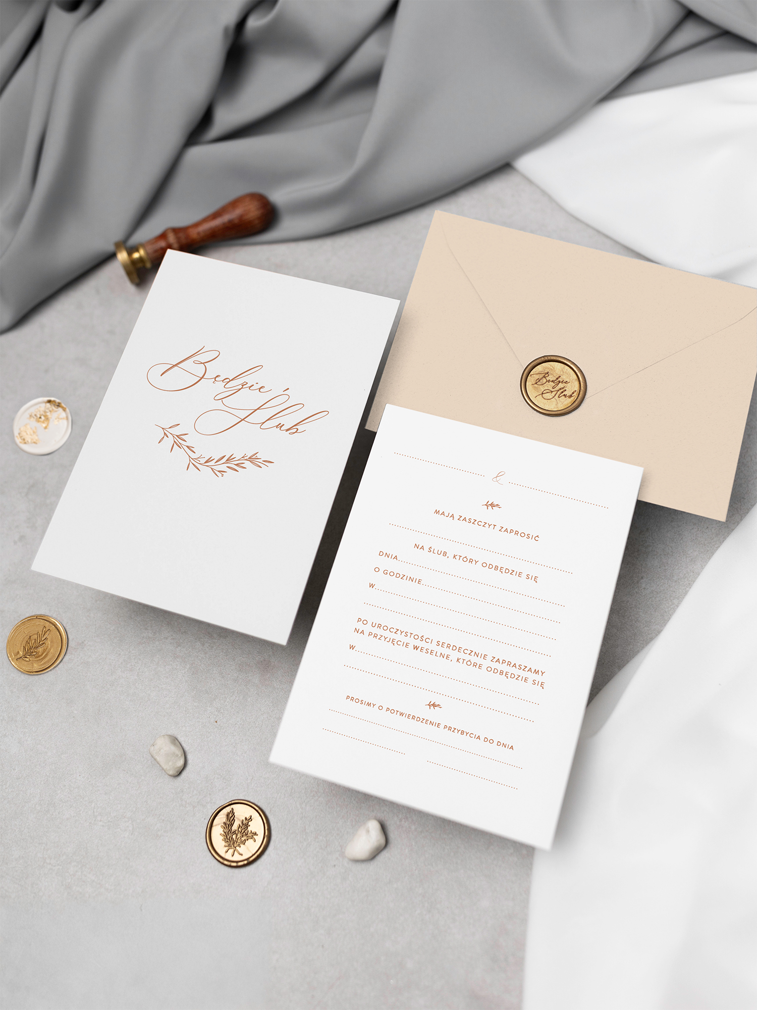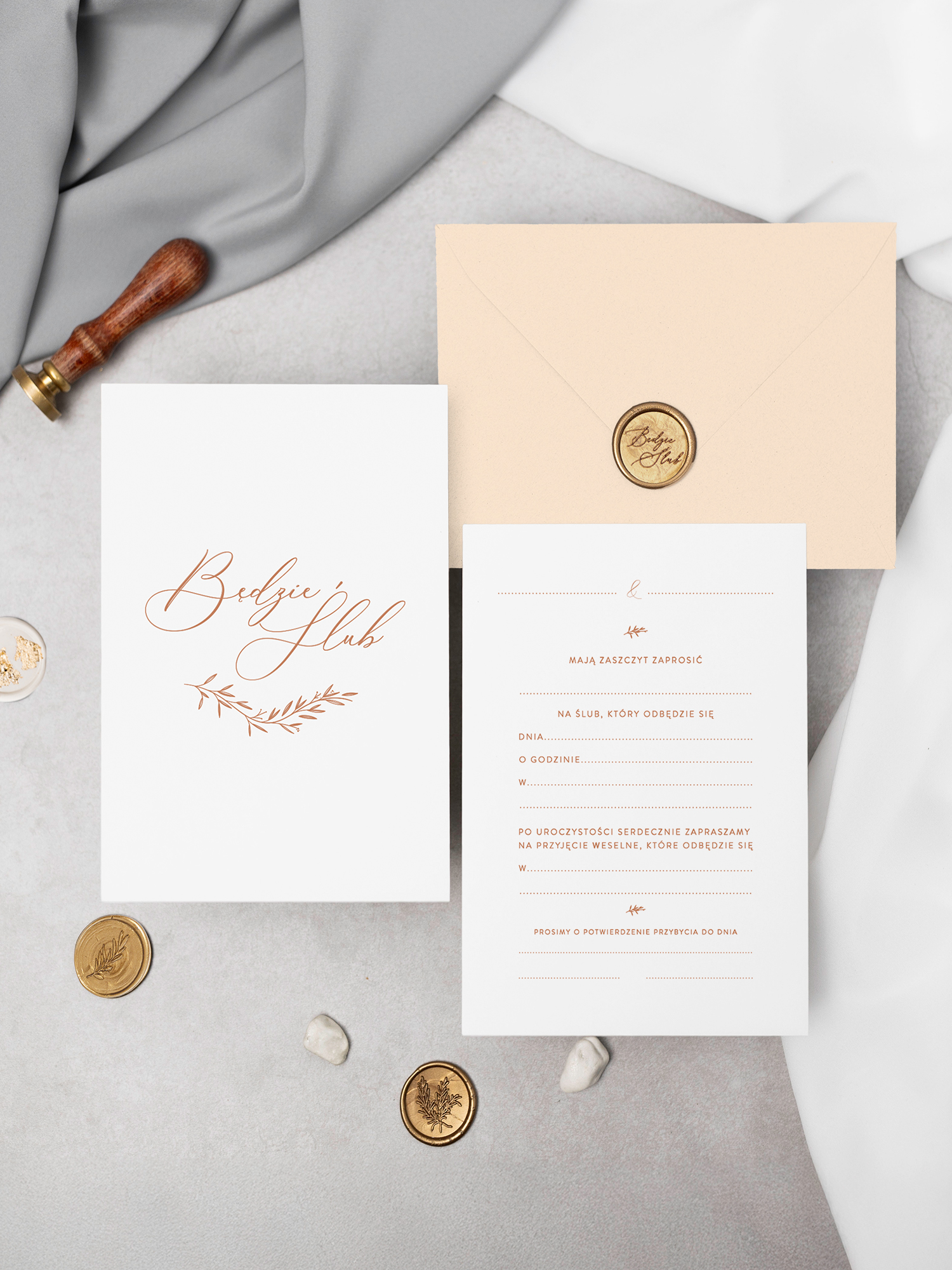 - Do zaproszeń możesz zamówić pozostałe elementy papeterii ślubnej.